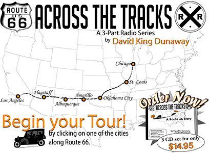 ACROSS THE TRACKS: A ROUTE 66 STORY is a national radio series which aired on NPR and PRI: three, one-hour audio documentaries, with music and readings from artists who’ve celebrated 66: Woody Guthrie, Ry Cooder, Jack Kerouac, John Steinbeck, Bobby Troup, plus dramatic excerpts from films and old radio – Orson Welles and Wolfman Jack.